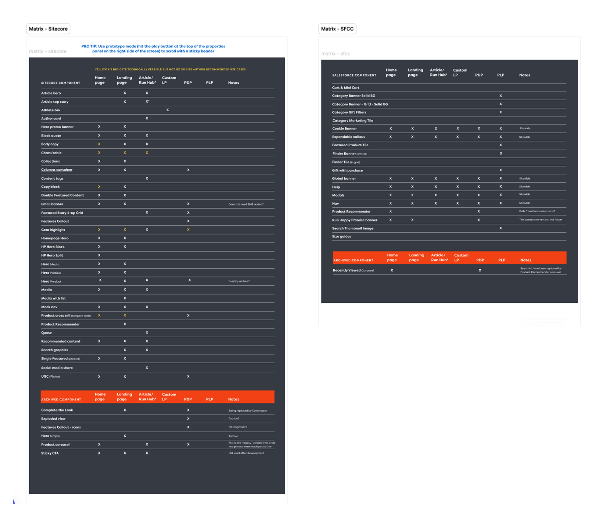 In 2020 Brooks, in partnership with our agency of record at the time, underwent a huge brand and website refresh. As a result of that effort, Brooks’ digital experience teams inherited design and development libraries across four tools—Sketch, Zeplin, Frontify, and Pattern Lab—each accounting for a different part of the design system and lifecycle. There was no clear internal strategy or governance process for the tools and over the next several years the design system became fragmented, outdated, and ownerless. This created workflow inefficiencies, design inconsistencies, and onboarding challenges across eCommerce, Marketing, and Digital Products teams.